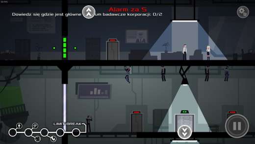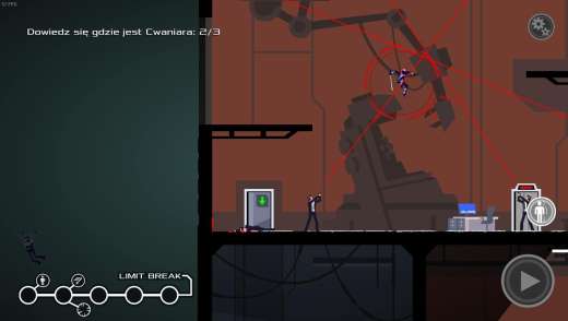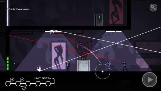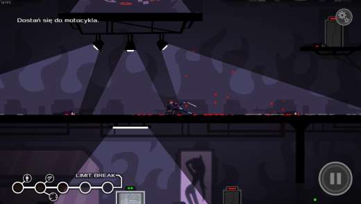 A to wszystko w całkiem prostej, lekko "flashówkowej" grafice. Na pewno jest to trochę odświeżające po standardowym, indyczym pixel arcie, ale nie jest to nic specjalnego. Grafika jest czytelna i poprawna, a design bardzo przyjemny. Czuć inspiracje japońskiego cyberpunku w designie przeciwników i stylu całej fabuły. Ale jeśli chodzi o część praktyczną tej minimalistycznej grafiki, to jest trochę gorzej. Na przykład skok wykonuje się klikając i przeciągając myszkę, rysuje się wtedy strzałka, która pokazuje gdzie postać wyląduje, ale nie jest to dokładne. Przy małych skokach strzałka pokazuje, że zeskoczymy z platformy na niższe piętro, ale zamiast tego postać jedynie się lekko poruszy i już jesteśmy trupem. Poza tym, wrogowie mają nad głowami cyfry - zazwyczaj chodzi o te 10 sekund do wezwania alarmu. Czasem jednak przeciwnik przeładowuje broń i mamy parę sekund zanim będzie gotowy znowu zaatakować. Przyznam, że zauważyłem tę mechanikę dopiero po paru misjach, ponieważ oznaczenie czy ktoś wzywa pomoc, czy przeładowuje, absolutnie niczym się od siebie nie różnią.