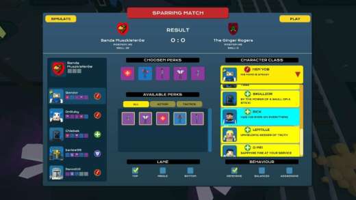 Na samym początku, młody i naiwny, szedłem całkowicie w realizm. Postacie sensownie rozdzielone na linie, oczywiście każdą trzeba bronić i atakować. Nawet nie symulowałem rozgrywki, ponieważ to był pewny sposób na przegraną, tylko uczestniczyłem w rozgrywce zarządzając zawodnikami. Kupowałem przedmioty potrzebne do zrównoważonego rozwoju (atak, prędkość postaci, regeneracja zdrowia, i tak dalej), reagowałem na zagrania przeciwników i kazałem postaciom zmieniać linie. Czyli tak, jak wygląda prawdziwa MOBA. Ale tutaj nie ma to najmniejszego sensu, w ten sposób tylko przegrywałem. Przeciwnik rzucił trzech czy czterech zawodników na jedną linię i było po zawodach. Dostosowywanie taktyk, zmiana postaci czy zakup nowych umiejętności pomagał w małym stopniu, mogłem pokonać parę prostych drużyn w niezobowiązujących sparingach, ale wygrywanie w lidze było niemożliwe. Wziąłem więc sprawy w swoje ręce. Odblokowałem wspomniane ulepszenie i zacząłem sam grać jedną z postaci i starałem się rozgryźć sposób na wygraną.