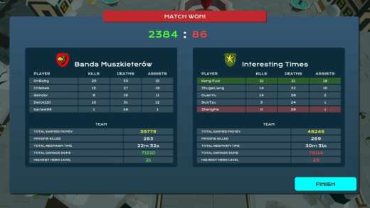 I tak po 16 godzinach doszedłem do końca. W teorii mógłbym grać dalej, wymaksować wszystkie osiągnięcia oraz zdobyć najwyższe miejsca w tabeli, ale po pierwsze to niemożliwe, ponieważ większość osiągnięć jest popsuta a miejsca w tabeli to prawdziwe lotto, po drugie skończył się już tak naprawdę fun. Na tryb FPS spojrzałem tylko przez chwilę, wbrew nazwie wygląda na praktycznie to samo. Widok dalej jest z rzutu ptaka, steruje się postaciami i każe zabijać przeciwników, brakuje tylko minionów i niszczenia inhibitorów. Szkoda, że nie postarano się bardziej i nie odtworzono tu lepiej tego gatunku albo i innych popularnych gier esportowych, tak by można było odkrywać tę grę na nowo parę razy. Rozczarowujący jest ten brak serca włożonego w ten tytuł, wszystko wykonane po linii namniejszego oporu, byleby tylko było bo musi być. Temat gry, który powinien być bliski twórcom, prosi się wręcz o dużo więcej ciekawych i zabawnych mechanik, easter eggów (ale przyznam, że chociaż nawiązanie do JoJo jest, widocznie komuś się jednak chciało) i zawartości.