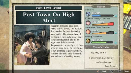 Choć gra została skonstruowana tak, by dwie z frakcji regularnie się ze sobą biły w jakichś odstępach czasowych, to my także możemy, a nawet powinniśmy wpływać na ich wspólne stosunki i wzniecać lub zaostrzać konflikty dla zbicia jeszcze większej fortuny, np. mordując ich członków pod osłoną nocy, wysyłając bronie najwyższej jakości czy darowując alkohol. Owszem, nie zabrakło możliwości zabicia każdej napotkanej postaci i, nawet jeśli przez nieskończoną naturę gry możemy równie ponownie popaść w długi, co spotkać zamordowanego lichwiarza, z pewnością zasmakujemy skutków tej czy innej nieodpowiedzialnej decyzji. Nie jest to ten sam schemat, co w klasycznym Way of the Samurai, gdzie zabicie postaci tworzyło jeszcze jedną odnogę fabularną, lecz teoria jest tu jak najbardziej na miejscu.